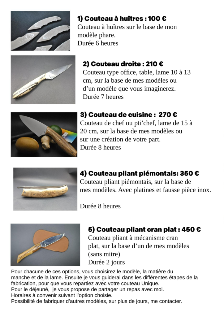 Sous l’œil expert de Stéphane, artisan coutelier d’art , vous apprendrez les bases de la fabrication de couteaux uniques. Chaque participant aura l’opportunité de créer son propre couteau, personnalisé selon ses goûts et son style.